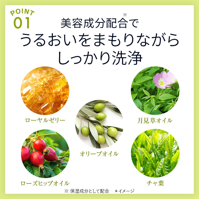 オリーブ果実油・コメヌカ油・トリエチルヘキサノイン・イソノナン酸イソノニル・ジオレイン酸ポリグリセリル-10・PPG-40ブチル・ジイソステアリン酸ポリグリセリル-2・セスキカプリル酸ポリグリセリル-2・スクワラン・ローズヒップ油・ブドウ種子油・ラベンダー油・ローヤルゼリーエキス・チャ葉・月見草油・オタネニンジンエキス・カミツレ花エキス・トコフェロール・水・BG・グリチルレチン酸ステアリル・ビサボロール・コカミドDEA・ラウロイルグルタミン酸ジ(フィトステリル・オクチルドデシル)・トリ(カプリル酸・カプリン酸)グリセリル・フェノキシエタノール