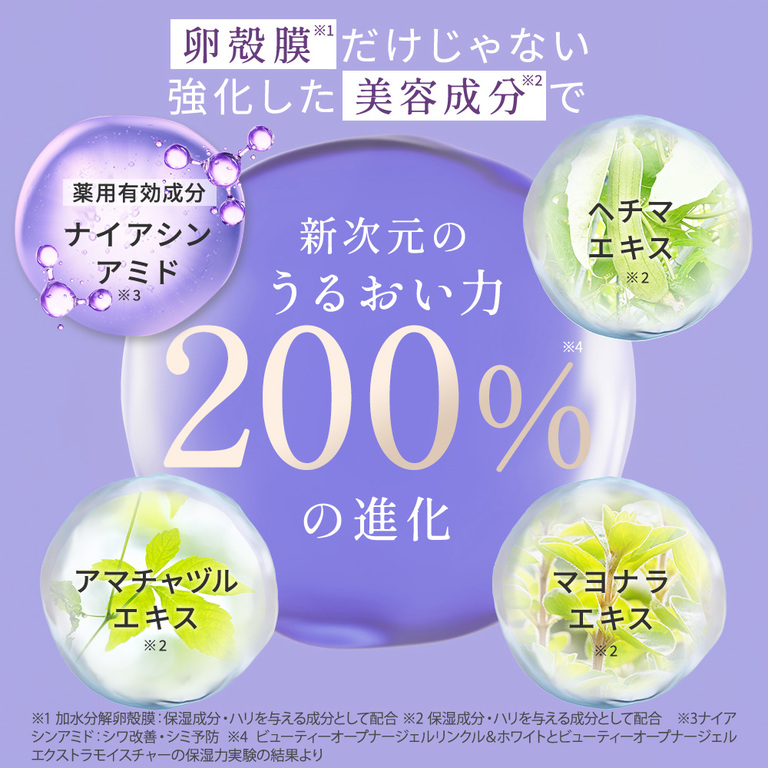 その他成分:精製水、1,2-ヘキサンジオール、1,3-ブチレングリコール、1,3-プロパンジオール、加水分解卵殻膜、N-ステアロイルジヒドロスフィンゴシン、N-ステアロイルフィトスフィンゴシン、アーティチョークエキス、アクリル酸・メタクリル酸アルキル共重合体、イザヨイバラエキス、サンゴ草抽出液、シュガースクワラン、スターフルーツ葉エキス、ヒドロキシステアリルフィトスフィンゴシン、ヒドロキシプロピル-β-シクロデキストリン、フィトステロール、メチルポリシロキサン、加水分解ヒアルロン酸、水酸化カリウム、水素添加大豆リン脂質、水溶性コラーゲン液(魚起源)、水溶性プロテオグリカン溶液S、濃グリセリン、アマチャヅルエキス、ヘチマエキス(1)、マヨラナエキス、N-ラウロイル-L-グルタミン酸ジ(フィトステリル・2-オクチルドデシル)、ウンデシレノイルフェニルアラニン、キサンタンガム、ジプロピレングリコール、トリ2-エチルヘキサン酸グリセリル、トリメチルグリシン、ポリエチレングリコール・デシルテトラデセス-20・ヘキサメチレンジイソシアネート共重合体、ポリオキシエチレン・メチルポリシロキサン共重合体、ワセリン、自己乳化型モノステアリン酸グリセリル、オレンジ油、香料、フェノキシエタノール