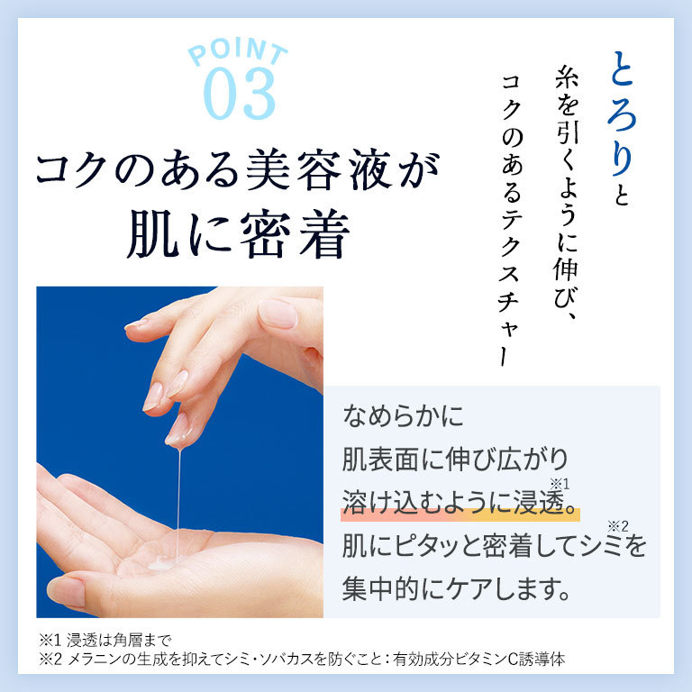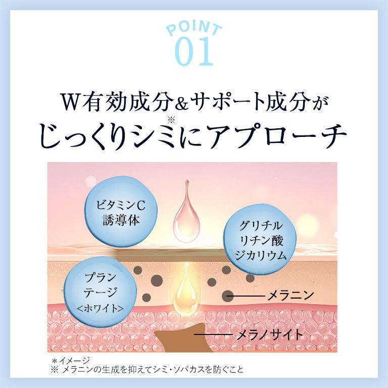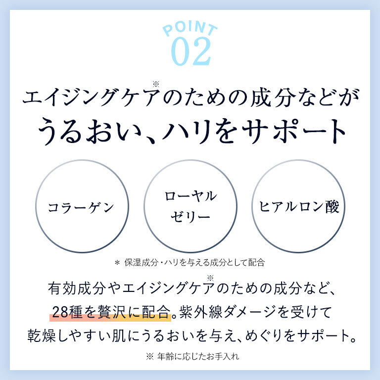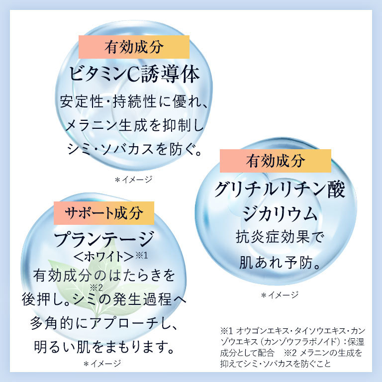 その他の成分:加水分解黒豆エキス・水溶性コラーゲン液・米糠抽出物加水分解液A・1,2ーペンタンジオール・1,3ーブチレングリコール・アルニカエキス・オトギリソウエキス・セイヨウキズタエキス・ハマメリスエキス・ブドウ葉エキス・マロニエエキス・カンゾウフラボノイド・オウゴンエキス・タイソウエキス・ニンジンエキス・ローヤルゼリーエキス・酵母エキス(3)・キサンタンガム・ゲンチアナエキス・ジエチレントリアミン五酢酸五ナトリウム液・ヒアルロン酸ナトリウム(2)・フィチン酸・フェノキシエタノール・プラセンタエキス(1)・プルーン酵素分解物・ホホバ油・ポリアクリル酸ナトリウム・メチルポリシロキサン・モノステアリン酸エチレングリコール・モノステアリン酸ソルビタン・モノステアリン酸ポリオキシエチレングリセリル・モノラウリン酸ポリグリセリル・ローズ水・海藻エキス(1)・海藻エキス(5)・硬化ナタネ油アルコール・高重合メチルポリシロキサン(1)・植物性スクワラン・水酸化カリウム・精製水・天然ビタミンE・濃グリセリン