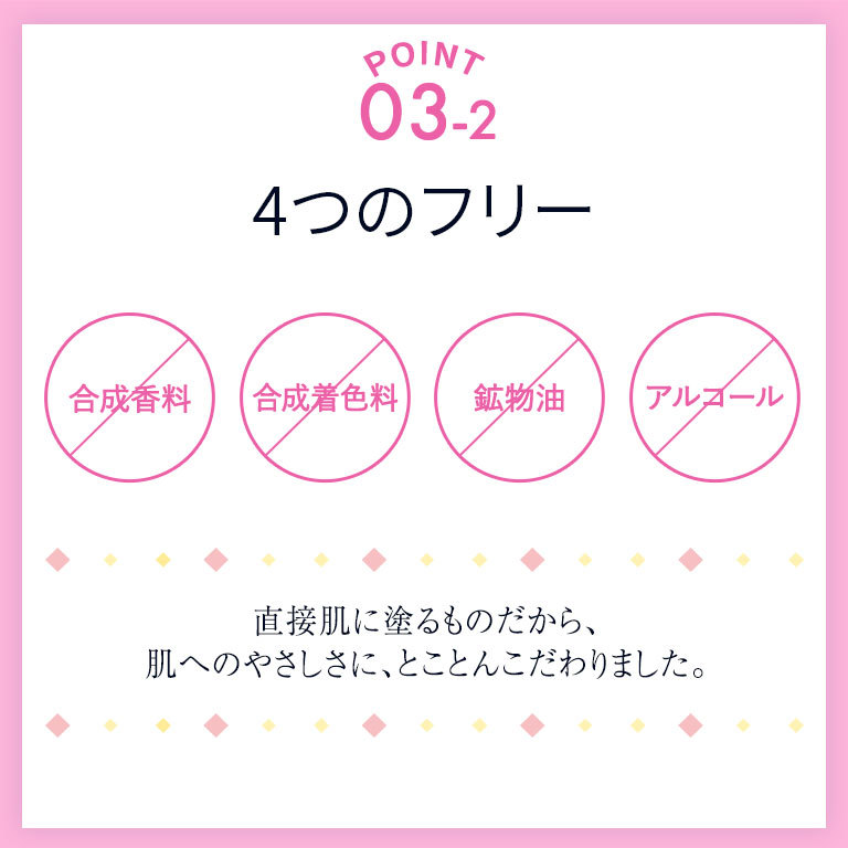 ●合成香料不使用●合成着色料不使用●旧表示指定成分不使用●鉱物油不使用●アルコール不使用