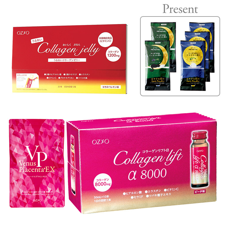 コラーゲンペプチド(ゼラチンを含む)(国内製造)、ガラクトオリゴ糖液糖、還元水飴、はちみつ、デキストリン、レモン果汁、エラスチン(魚由来)、植物発酵エキス末(デキストリン、糖類、野草エキス、果物エキス、野菜エキス、海藻エキス)(りんご・大豆・キウイフルーツ・バナナ・ももを含む)、ヒアルロン酸、プロテオグリカン含有サケ鼻軟骨抽出物(デキストリン、サケ鼻軟骨抽出物)、ツバメ巣加工品、パイナップル果実抽出物(セラミド含有)、こんにゃく芋粉抽出物(セラミド含有)/pH調整剤、ゲル化剤(増粘多糖類)、ビタミンC、香料、甘味料(アセスルファムカリウム、スクラロース)、ヒアルロン酸、L-シスチン、グリセリン、乳化剤(大豆由来)