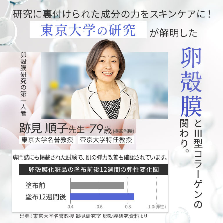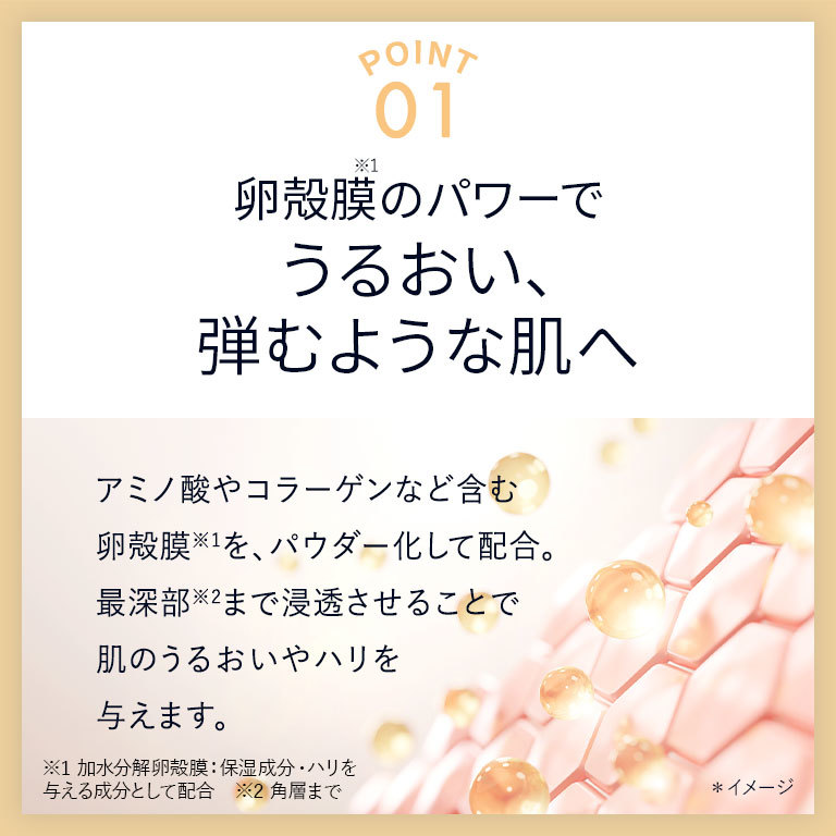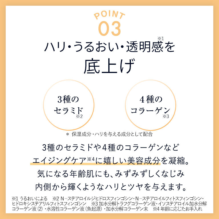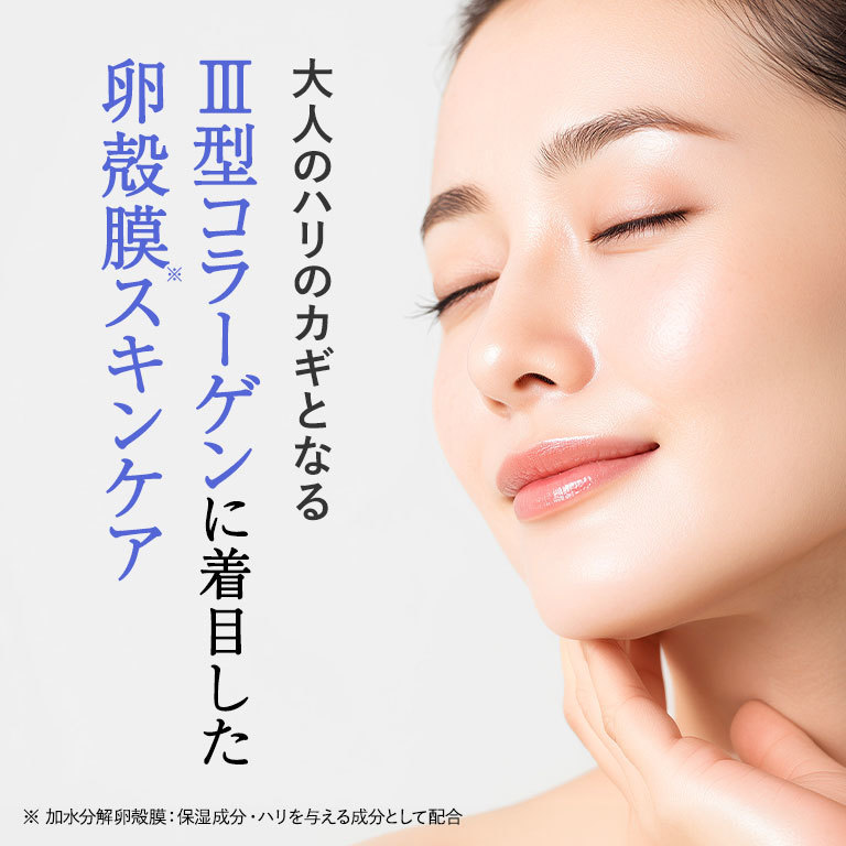 その他成分 精製水・1,2-ペンタンジオール・1,3-ブチレングリコール・DL-ピロリドンカルボン酸ナトリウム液・加水分解卵殻膜・N-ステアロイルジヒドロスフィンゴシン・N-ステアロイ ルフィトスフィンゴシン・アーティチョークエキス・イソステアリン酸・イソステアロイル加水分解コラーゲン液(2)・エイジツエキス・エクトイン・オリーブ葉エキス・キサンタンガム・ク エン酸・クエン酸ナトリウム・シュガースクワラン・スターフルーツ葉エキス・ニーム葉エキス・ヒアルロン酸ナトリウム(2)・ヒドロキシステアリルフィトスフィンゴシン・ヒドロキシプロ ピル-β-シクロデキストリン・ヒメフウロエキス・フィトステロール・プルーン酵素分解物・ポリオキシエチレンポリオキシプロピレンデシルテトラデシルエーテル・ポリオキシエチレン メチルグルコシド・マツエキス(2)・マヨラナエキス・ローズマリーエキス・加水分解コラーゲン末・加水分解トラフグコラーゲン液・加水分解ヒアルロン酸・海藻エキス(5)・酵母エ キス(3)・香料・水酸化カリウム・水素添加大豆リン脂質・水溶性コラーゲン液(魚起源)・濃グリセリン・フェノキシエタノール