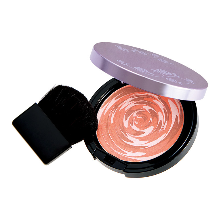 上品な色合いの「コーラル、オレンジ、ホワイトピンク」の3色を円を描くようにブラシで混ぜ合わせ、さっと頬にのせるだけで、立体感のある薔薇色フェイスを演出します。