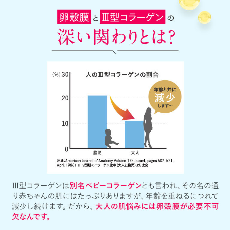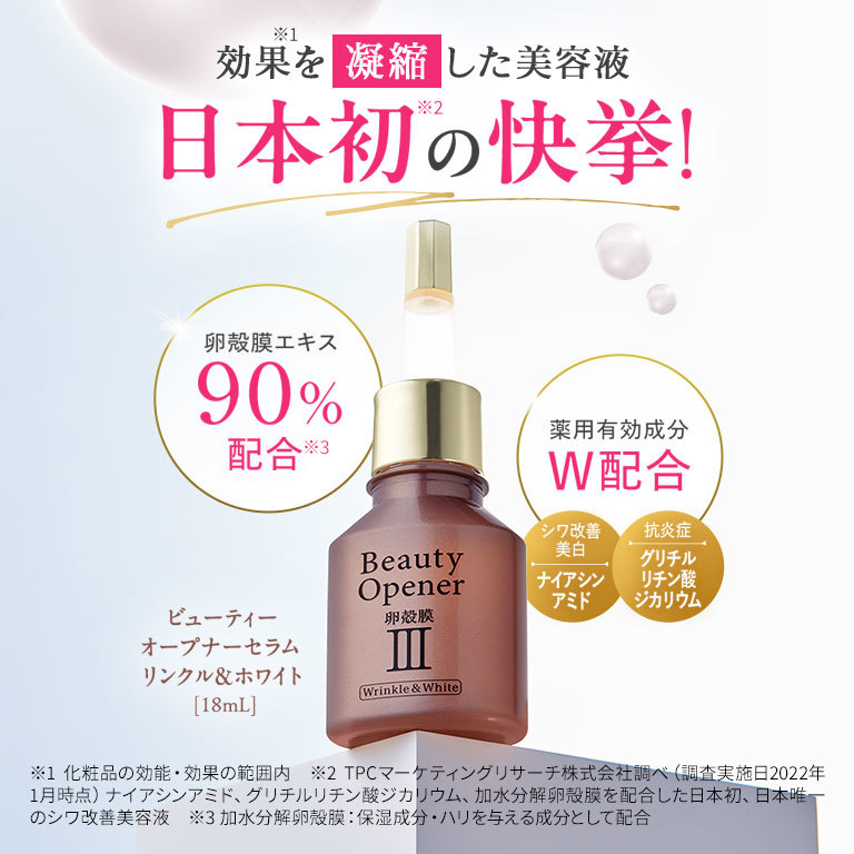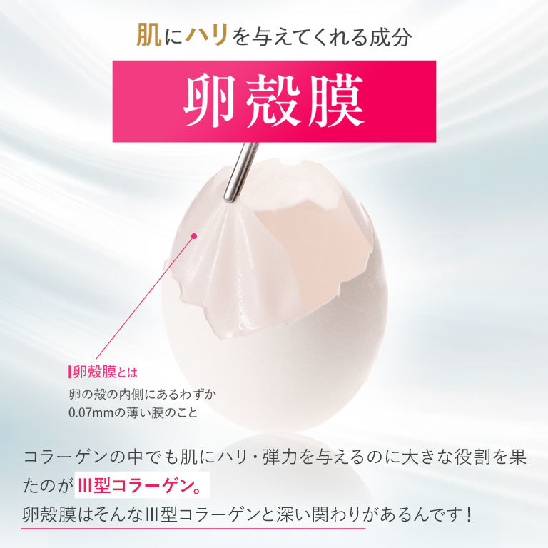 「卵殻膜エキス」に加えて、シワ改善・美白*のWのパワーをもつ「ナイアシンアミド」と、肌老化のもととなるといわれる炎症を防ぐ「グリチルリチン酸ジカリウム」を配合した美容液です。導入効果で肌へ届く力をアップさせながら、大人の肌悩みにこたえます。