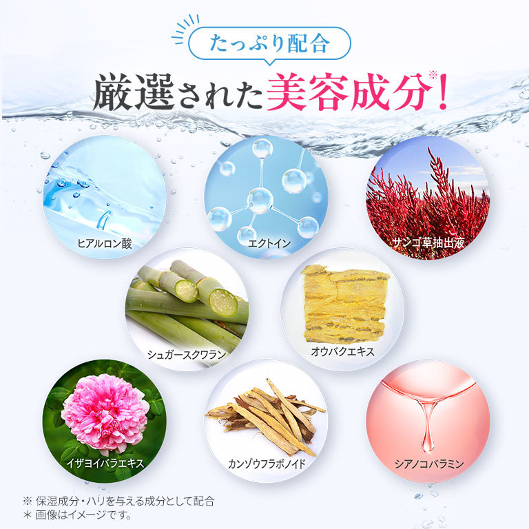その他成分:精製水、1,3-ブチレングリコール、1,2-ペンタンジオール、加水分解卵殻膜、ヒアルロン酸ナトリウム(2)、シュガースクワラン、カンゾウフラボノイド、イザヨイバラエキス、ローズマリー油、エクトイン、サンゴ草抽出液、オウバクエキス、シアノコバラミン、ヒドロキシプロピル-β-シクロデキストリン、ポリオキシエチレンポリオキシプロピレンデシルテトラデシルエーテル、クエン酸ナトリウム、クエン酸、トリメチルグリシン、シクロヘキサンジカルボン酸ビスエトキシジグリコール、2-メタクリロイルオキシエチルホスホリルコリン・メタクリル酸ブチル共重合体液、香料(天然精油)