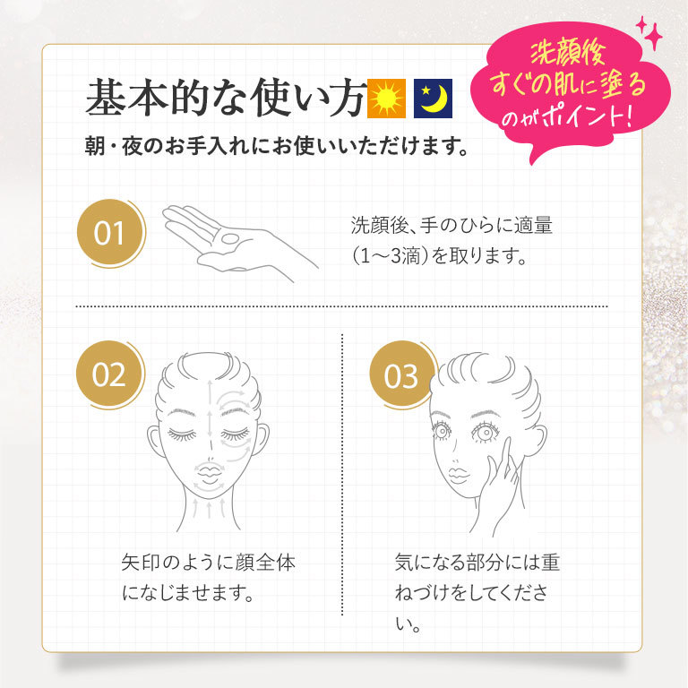 朝と夜のお手入れにお使いいただけます。洗顔後、1~3滴(1円硬貨大)を手に取り、お肌にやさしくなじませます。気になる部分は重ねづけを。その後、化粧水やクリーム等でお肌を整えてください。