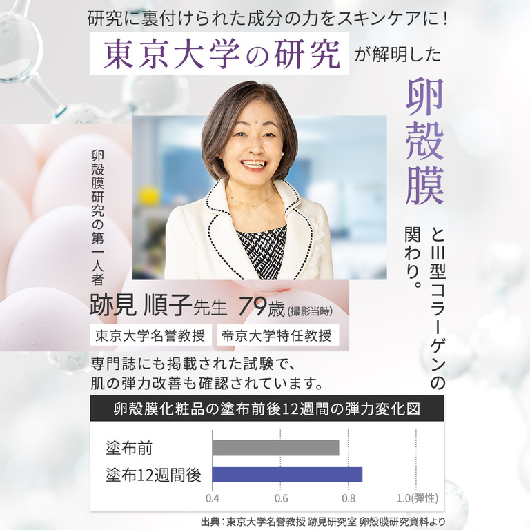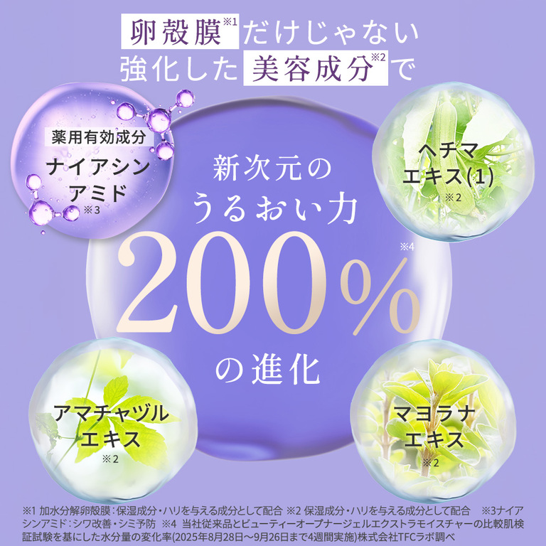 その他成分:精製水、1,2-ヘキサンジオール、1,3-ブチレングリコール、1,3-プロパンジオール、加水分解卵殻膜、N-ステアロイルジヒドロスフィンゴシン、N-ステアロイルフィトスフィンゴシン、アーティチョークエキス、アクリル酸・メタクリル酸アルキル共重合体、イザヨイバラエキス、サンゴ草抽出液、シュガースクワラン、スターフルーツ葉エキス、ヒドロキシステアリルフィトスフィンゴシン、ヒドロキシプロピル-β-シクロデキストリン、フィトステロール、メチルポリシロキサン、加水分解ヒアルロン酸、水酸化カリウム、水素添加大豆リン脂質、水溶性コラーゲン液(魚起源)、水溶性プロテオグリカン溶液S、濃グリセリン、アマチャヅルエキス、ヘチマエキス(1)、マヨラナエキス、N-ラウロイル-L-グルタミン酸ジ(フィトステリル・2-オクチルドデシル)、ウンデシレノイルフェニルアラニン、キサンタンガム、ジプロピレングリコール、トリ2-エチルヘキサン酸グリセリル、トリメチルグリシン、ポリエチレングリコール・デシルテトラデセス-20・ヘキサメチレンジイソシアネート共重合体、ポリオキシエチレン・メチルポリシロキサン共重合体、ワセリン、自己乳化型モノステアリン酸グリセリル、オレンジ油、香料、フェノキシエタノール