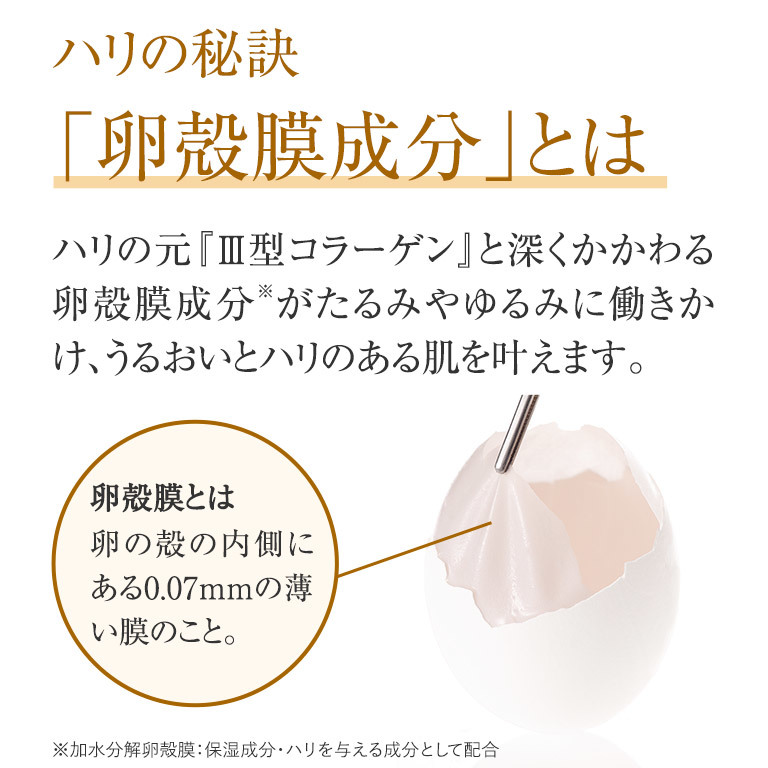 その他成分:精製水、1,2-ヘキサンジオール、1,3-ブチレングリコール、1,3-プロパンジオール、加水分解卵殻膜、N-ステアロイルジヒドロスフィンゴシン、N-ステアロイルフィトスフィンゴシン、アーティチョークエキス、アクリル酸・メタクリル酸アルキル共重合体、イザヨイバラエキス、イノシット、グリセリル-N-(2-メタクリロイルオキシエチル)カルバメート・メタクリル酸ステアリル共重合体、グリセリルグルコシド液、サンゴ草抽出液、ジグリセリン、シュガースクワラン、スターフルーツ葉エキス、ヒドロキシステアリルフィトスフィンゴシン、ヒドロキシプロピル-β-シクロデキストリン、フィトステロール、ポリアクリル酸アミド、ポリオキシエチレンラウリルエーテル(7E.O.)、メチルフェニルポリシロキサン、メチルポリシロキサン、加水分解ヒアルロン酸、軽質流動イソパラフィン、水酸化カリウム、水素添加大豆リン脂質、水溶性コラーゲン液(魚起源)、水溶性プロテオグリカン溶液S、濃グリセリン、オレンジ油、香料、フェノキシエタノール