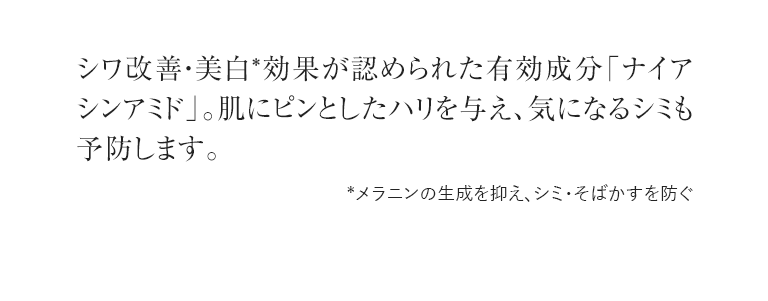*1 薬用有効成分ナイアシンアミド:シワ改善 *2 薬用有効成分ナイアシンアミド:メラニンの生成を抑え、シミ・そばかすを防ぐ *3 薬用有効成分グリチルリチン酸ジカリウム:肌あれ予防 *4 うるおいによる